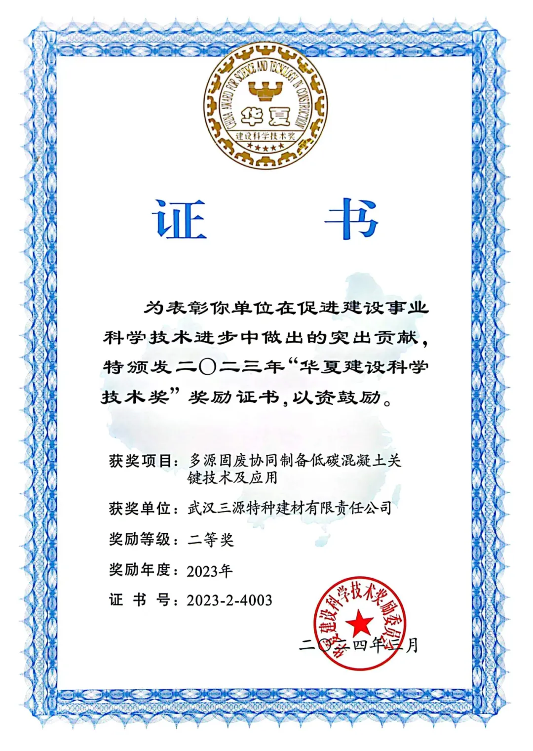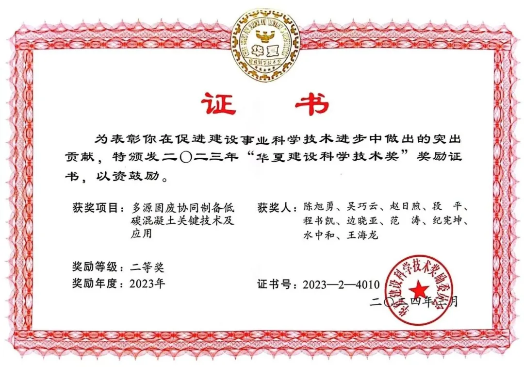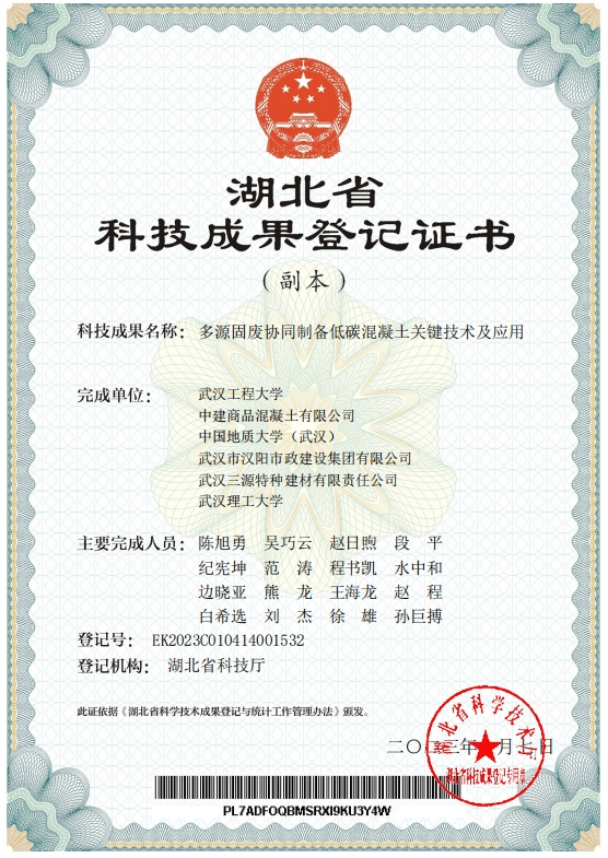 近日,住房和城乡建设部华夏建设科学技术奖励委员会发布“2023年度华夏建设科学技术奖”授奖公告,由武汉工程大学牵头,武汉三源等多单位参与完成的《多源固废协同制备低碳混凝土关键技术及应用》项目成果喜获华夏建设科学技术奖二等奖。