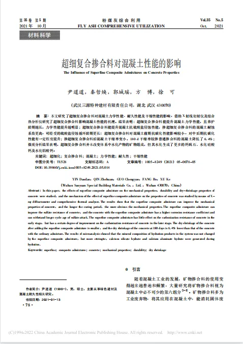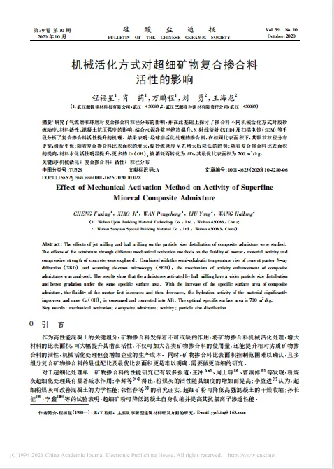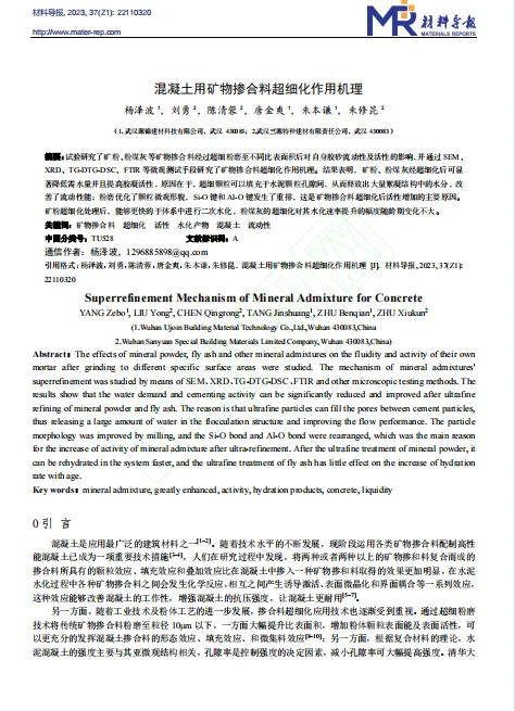 与传统矿物掺合料相比,超细掺合料具有较高细度(比表面积≥650m2/kg),在混凝土中能起到更好的填充、解絮和润滑作用,极大地改善了混凝土的工作性能和力学性能,优化混凝土配合比设计,节约水泥用量,对于现代混凝土的提质增效具有较大的意义。